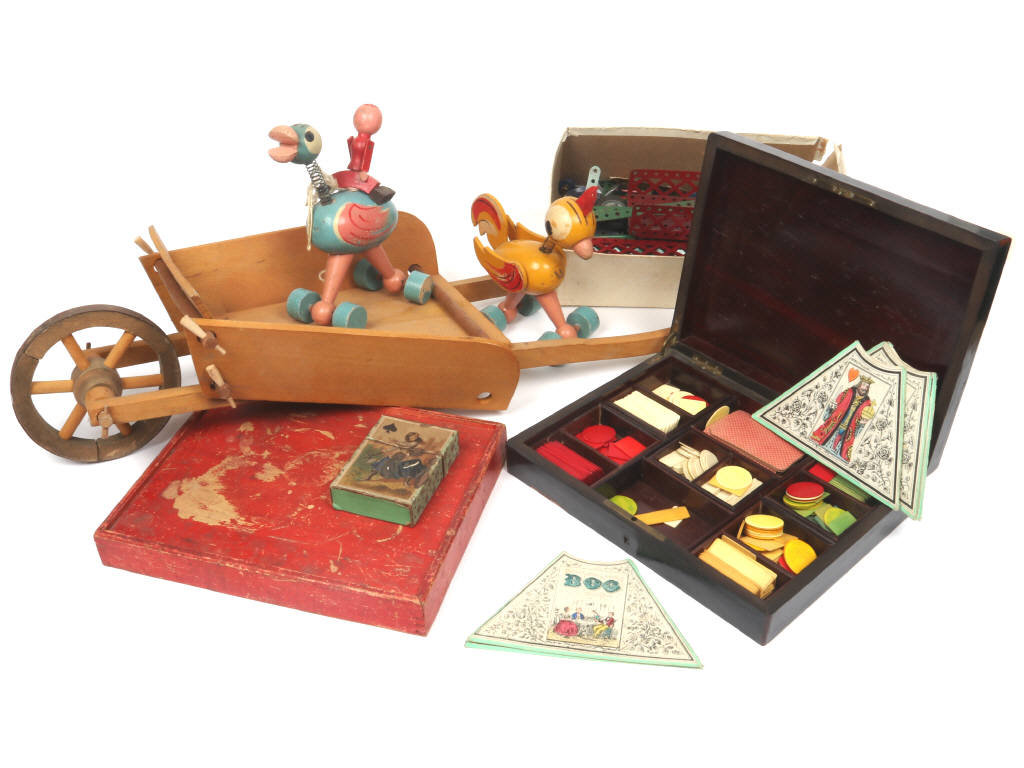 comprend notamment : nain jaune, jeu de cartes, brouette & éléments de construction - on y retrouve notamment la marque MECCANO - quelques petits éléments non conformes