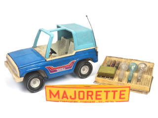 longueur : 45 cm - modèle très encrassé - quelques parties cassées - on y joint un présentoir de fioles de parfum (3 fioles présentes, boite en état 'd'), 3 bouchons de carafe en verre soufflé & un élément de présentoir 'MAJORETTE' (avec quelques taches)