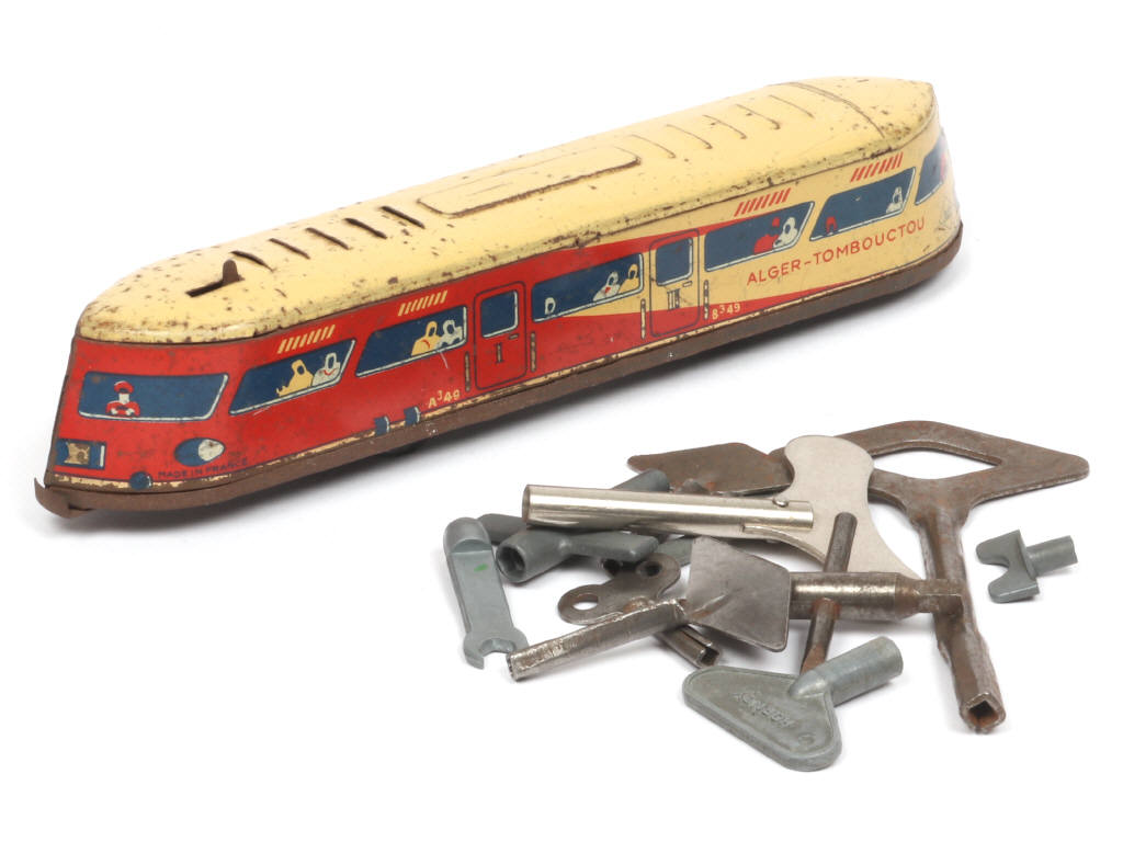 longueur : 20 cm - moteur à clef (fonctionne) - quelques petites déformations, parties ternies & traces d'oxydation - on y joint un ensemble de 11 clefs (traces d'oxydation sur certaines, HORNBY, SOLIDO & MINIC...)