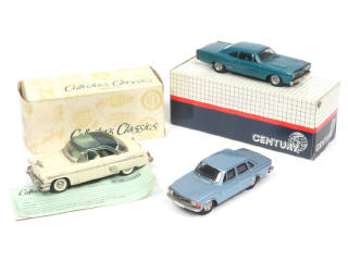 comprend les modèles : MERCURY, PLYMOUTH & VOLVO (sans boite) - on y retrouve les marques : CENTURY, COLLECTOR'S CLASSICS & ROBEDDIE MODELS - boites en états 'b' & 'c'