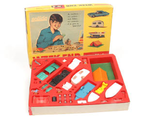 états des pièces : 'A+' à 'C' - dimensions du coffret : 38 x 27 cm (quelques petits accrocs par endroits) - contient : une FORD THUNDERBIRD, caravane NOTIN, canot à moteur, remorque-plateau, tente, 3 figurines & différents accessoires (dont certains manquants, sans notice)