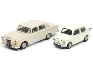 créations artisanales sur base NOREV - avec étiquettes 'CREATIONS RD-MANOU 1967 & 68 MARMANDE' (photocopies) collées sur les planchers - comprend : MERCEDES 220 & FIAT 600 ABARTH