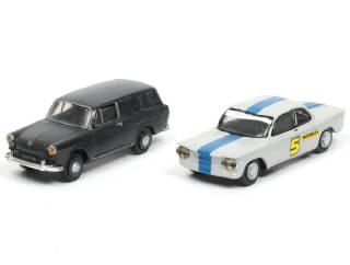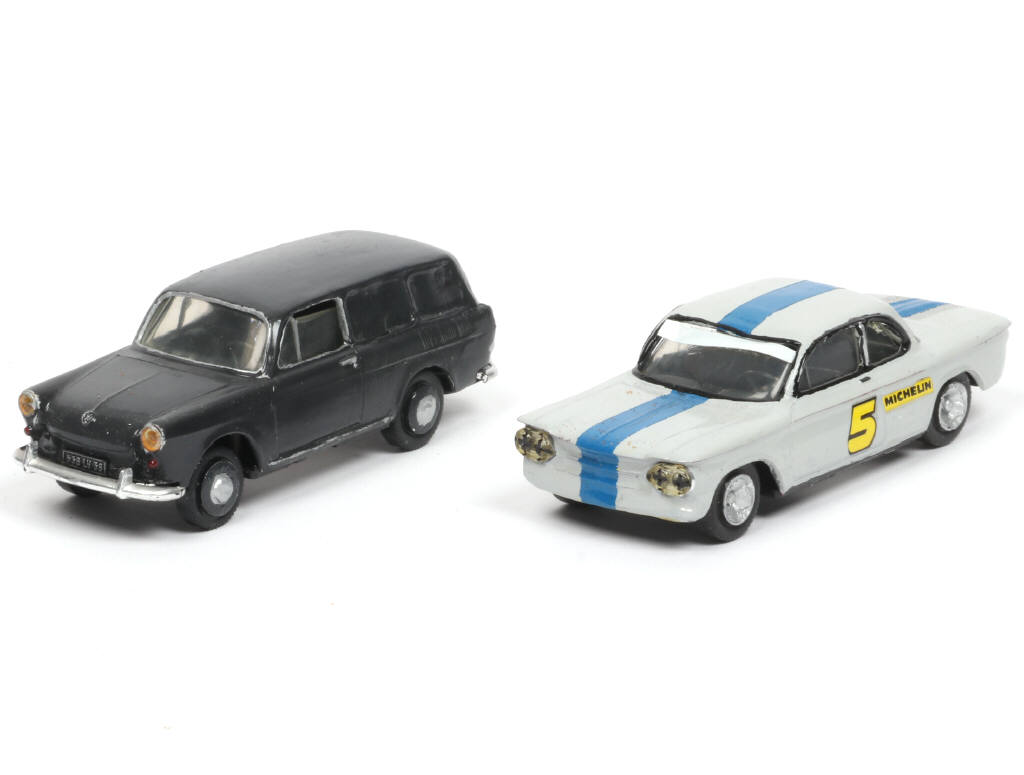 créations artisanales sur base NOREV - avec étiquettes 'CREATIONS RD-MANOU 1968 & 69 MARMANDE' (photocopies) collées sur les planchers - comprend : VOLKSWAGEN 1600 tôlé & CHEVROLET CORVAIR de compétition