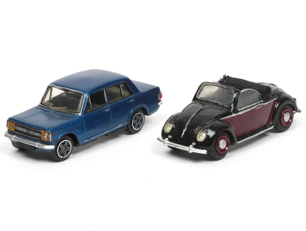 créations artisanales sur base NOREV - avec étiquettes 'CREATIONS RD-MANOU 1967 & 70 MARMANDE' (photocopies) collées sur les planchers - comprend : VOLKSWAGEN COCCINELLE cabriolet & FIAT 124