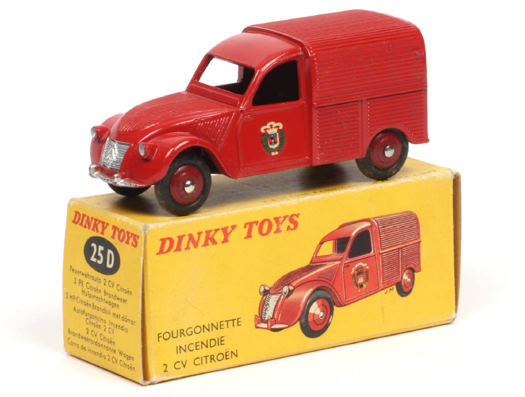 DINKY TOYS (FRANCE) 25D CITROËN 2CV Fourgonnette de pompiers rouge, jantes convexes bordeaux