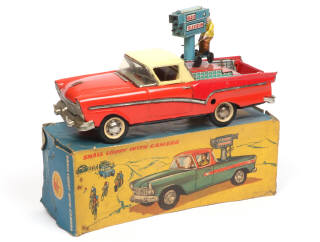 longueur 29,5 cm - avec moteur à clef & caméraman rotatif (fonctionnent) - quelques petits frottements par endroits - parties chromées plus ou moins ternies avec petites traces d'oxydation par endroits - vitre de lunette arrière déformée - un rabat de boîte non d'origine