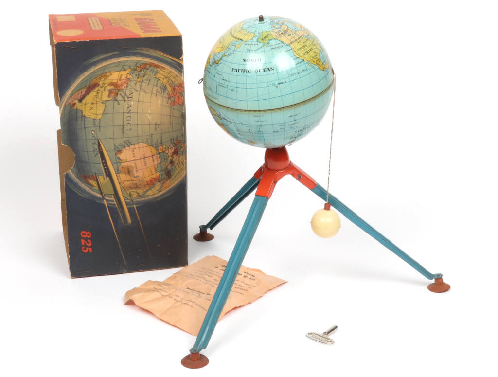 hauteur : 37 cm - comprend un tripode (quelques frottements plus ou moins importants sur certaines extrémités de bras, ventouses plus ou moins craquelées) & mappemonde avec un satellite (moteur à clef fonctionne, notice & clef présentes) - quelques accrocs sur la boîte par endroits
