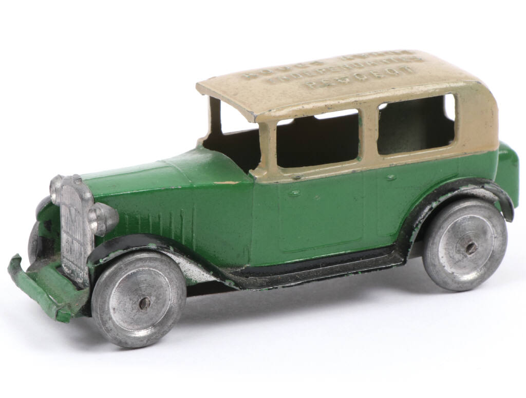 modèle en plomb avec plancher en tôle (légèrement déformé) - promotionnel réalisé pour le salon de l'auto 1931 avec le slogan 'ROUES AVANT INDEPENDANTES PEUGEOT', en relief sur le toit - éclats principalement sur les bas-de-caisses & passages de roues - TRÈS BEL ÉTAT POUR UN MODÈLE AUSSI ANCIEN !