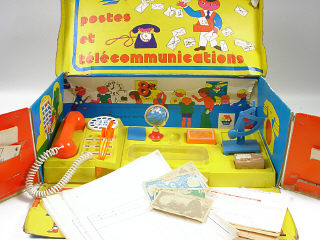 dimensions : 46 x 22,5 x 17 cm - le coffret représente un guichet de poste - contient différents documents & accessoires - quelques petits manques - plateau du pèse-lettres à recoller - 46 x 22.5 x 17 cm - the boxset represents a post office counter - contains various documents & accessories - some parts missing - tray from the letter scales to be re-glued
