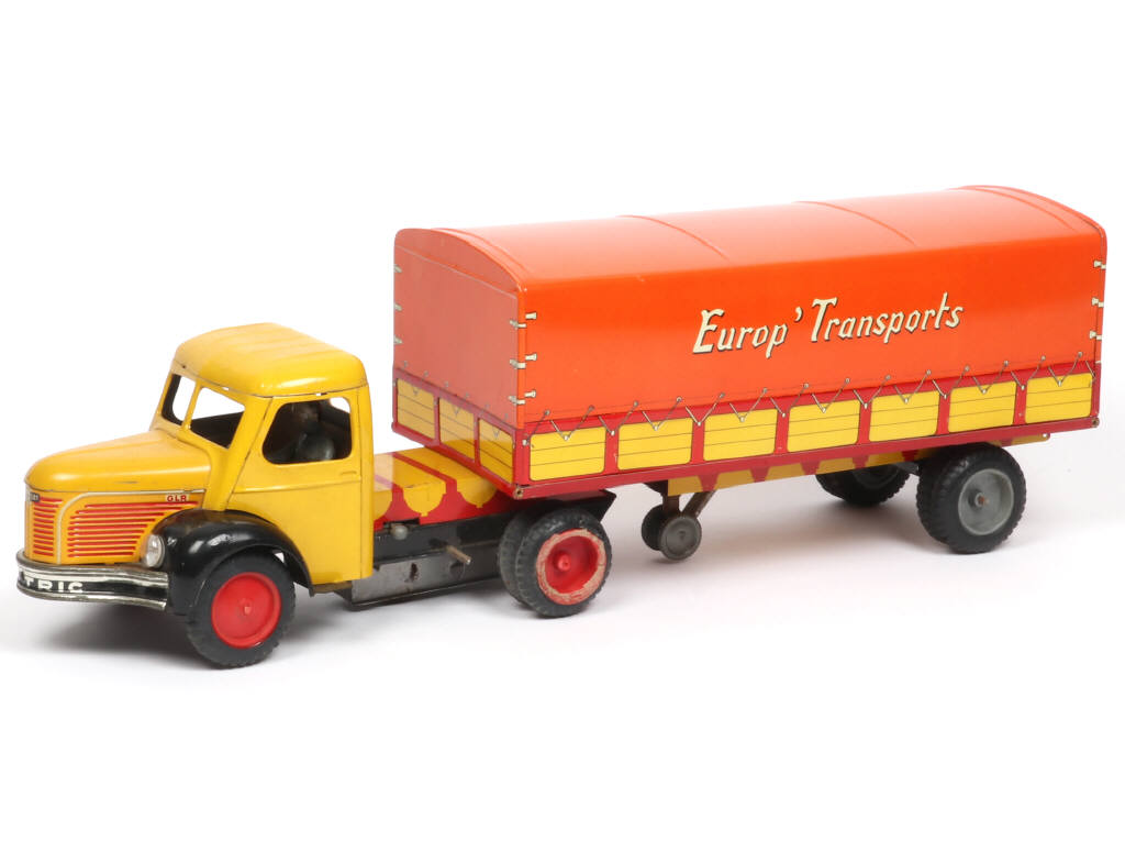 longueur 51 cm - avec moteur à clef (fonctionne, mais bloqué par les jantes, plus ou moins fondues), phares électriques (non testés), direction & conducteur - fixation d'attelage du tracteur désolidarisée - quelques frottements plus ou moins importants sur le tracteur - certains éléments chromés plus ou moins ternis & oxydés