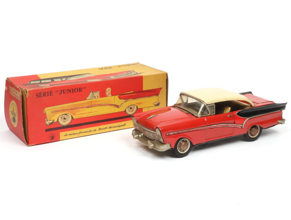 série 'JUNIOR' - longueur 29 cm - moteur à friction (fonctionne) - traces d'oxydation plus ou moins importantes sur les parties chromées par endroits (notamment sur les enjoliveurs de roues & le pare-choc arrière) - boîte légèrement salie avec quelques petits accrocs, légères déchirures & petites taches par endroits