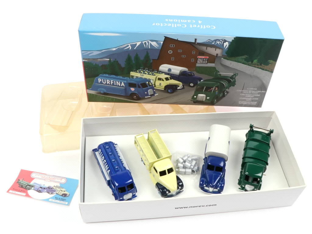 copies des modèles DINKY TOYS - comprend : FORD citerne 'PURFINA', FORD benne à ordures 'VILLE DE POISSY', STUDEBAKER laitier 'SAFR' & STUBAKER bâché 'POTASSE D'ALSACE' - avec sachet de 10 bidons à lait & certificat d'édition limité numéroté 74/1000 exemplaires - cale supérieure de boite jaunie
