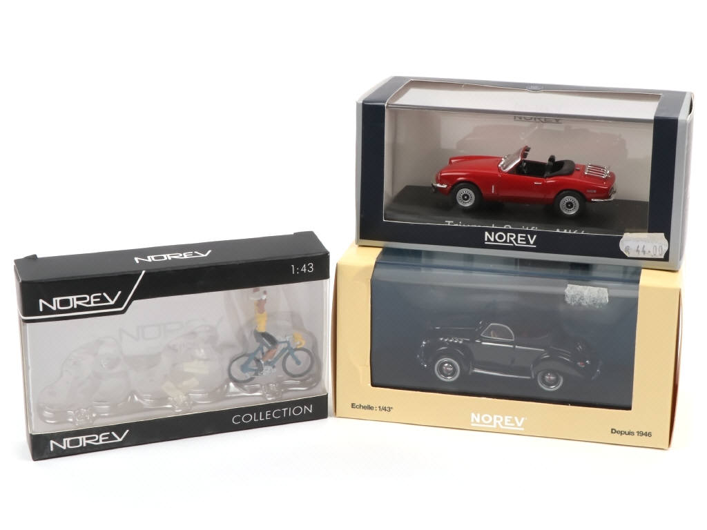comprend : TRIUMPH SPITFIRE MK4 & PANHARD DYNA X cabriolet (déformation sur la boite) - on y joint un coffret incomplet contenant un cycliste