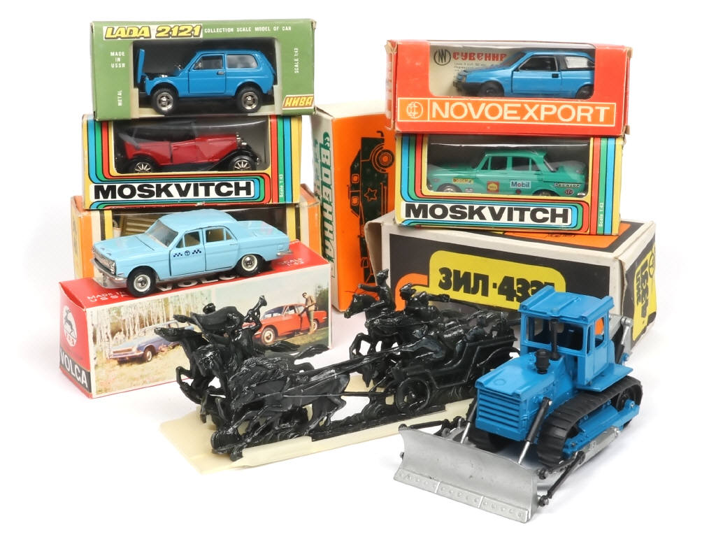 miniatures reproduisant notamment les modèles : VOLGA, GAZ (boîte non conforme), MOSCKVITCH (un exemplaire avec décalques ajoutés) & LADA (importantes craquelures de peinture sur le capot-moteur) - on y joint 6 cavaliers sur leur monture & un train d'artillerie - avec manques & parties cassées (plus ou moins importants suivant les modèles) - les boîtes sont en états 'b' & 'c' (un exemplaire sans boîte)