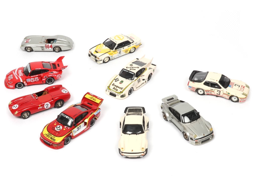 miniatures reproduisant les modèles : FERRARI, PORSCHE (un exemplaire avec 3 garnitures de jantes manquantes & 2 autres avec ailerons à positionner), MERCEDES & OPEL
