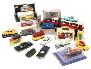 on y retrouve notamment les marques : ROAD SIGNATURE, ALTAYA & CONRAD - 11 exemplaires en boîtes (états 'a' à 'c', certaines non d'origine) - quelques manques & parties cassées - un exemplaire en état 'E'