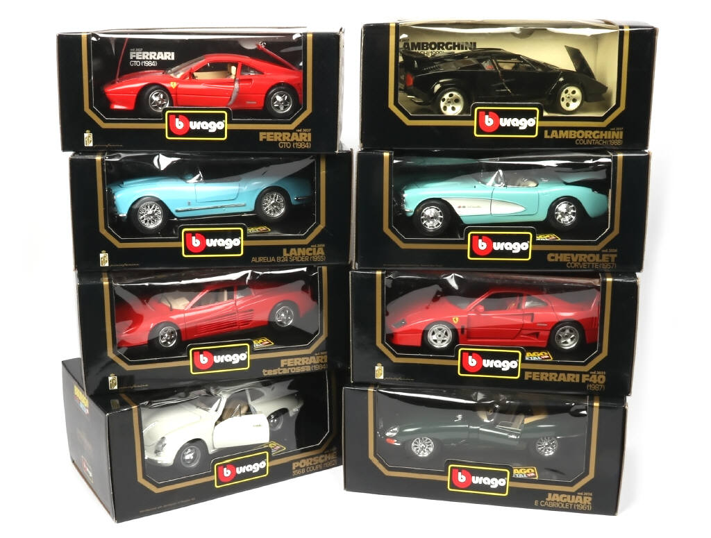 échelle 1/18ème - comprend les modèles : FERRARI TESTAROSSA, GTO, F40, LANCIA AURELIA, PORSCHE 356B, JAGUAR TYPE E, CHEVROLET CORVETTE & LAMBORGHINI COUNTACH