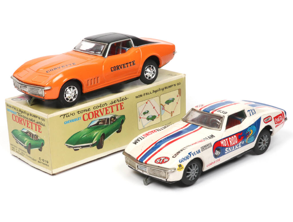 longueur : 26,5 cm - moteurs à piles (à revoir) - vitre de portière conducteur fendue - avec une autre CHEVROLET CORVETTE de la marque en état 'C' (sans boîte, roues non d'origine)