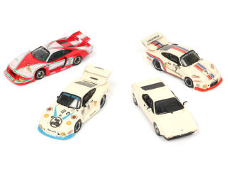 kits montés en résine - miniatures reproduisant les modèles : FERRARI, PORSCHE (2 exemplaires) & BMW - quelques petites salissures sur les carrosseries par endroits