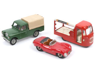 comprend : U.D. MILK FLOAT (état 'B' - petits détails de peinture ajoutés, manque autocollant de plaque minéralogique arrière - plancher vissé avec vis non d'origine), LAND ROVER & JAGUAR XK SS (2 modèles en état 'R')
