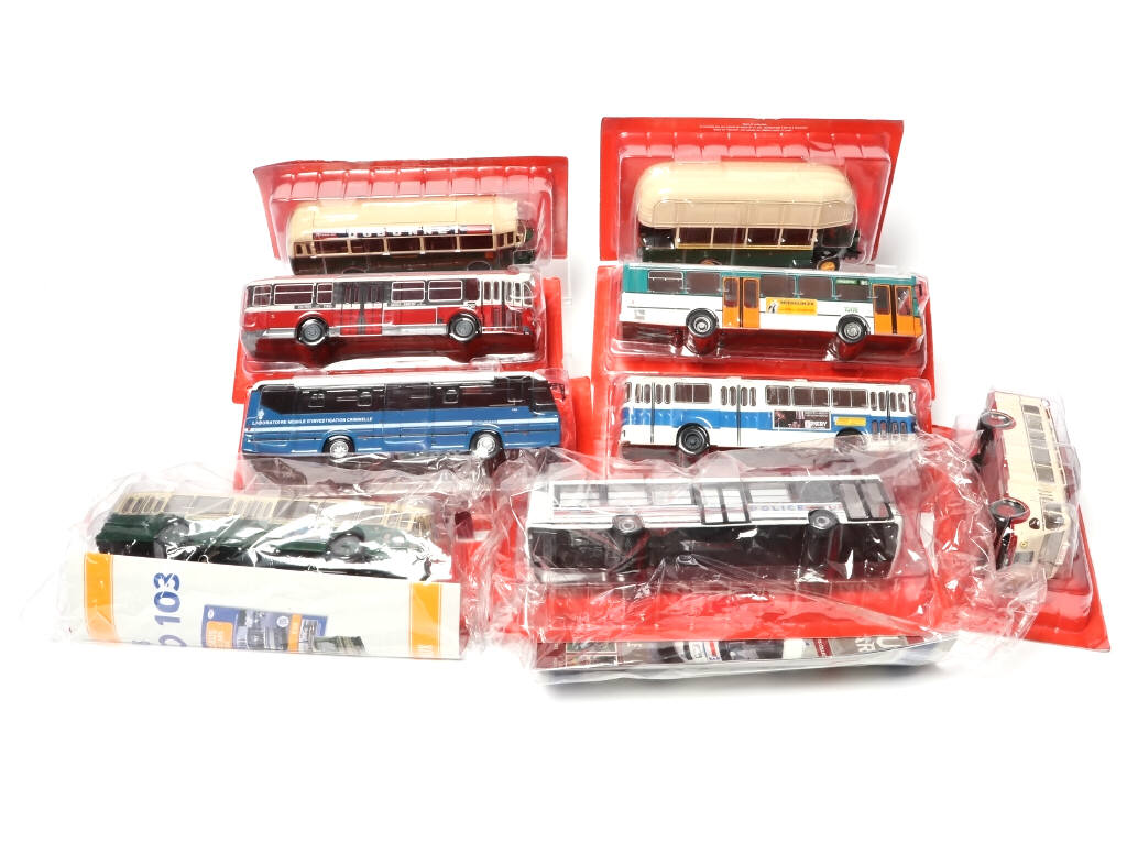 collection "AUTOBUS & AUTOCARS DU MONDE" - comprend notamment les modèles : SAVIEM SCIOU, HEULIEZ 0 305 & BERLIET PHL - 2 modèles sous plastique avec fascicules
