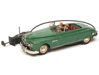 longueur : 25,5 cm - avec 2 personnages en composition - mécanisme à manivelle (fonctionne) & poussoir (à revoir) - roues non d'origine - éclats plus ou moins importants sur la carrosserie par endroits - traces d'oxydation sur le boîtier de commandes (peinture craquelée) & le câble - vitre de pare-brise dégrafée