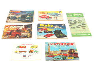 on y retrouve les marques : CORGI TOYS (année 1980/81), DINKY TOYS (notamment 1968 & 1973) & MATCHBOX (1966 & 82/83) - on y joint un catalogue de la marque RMM (1983)