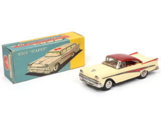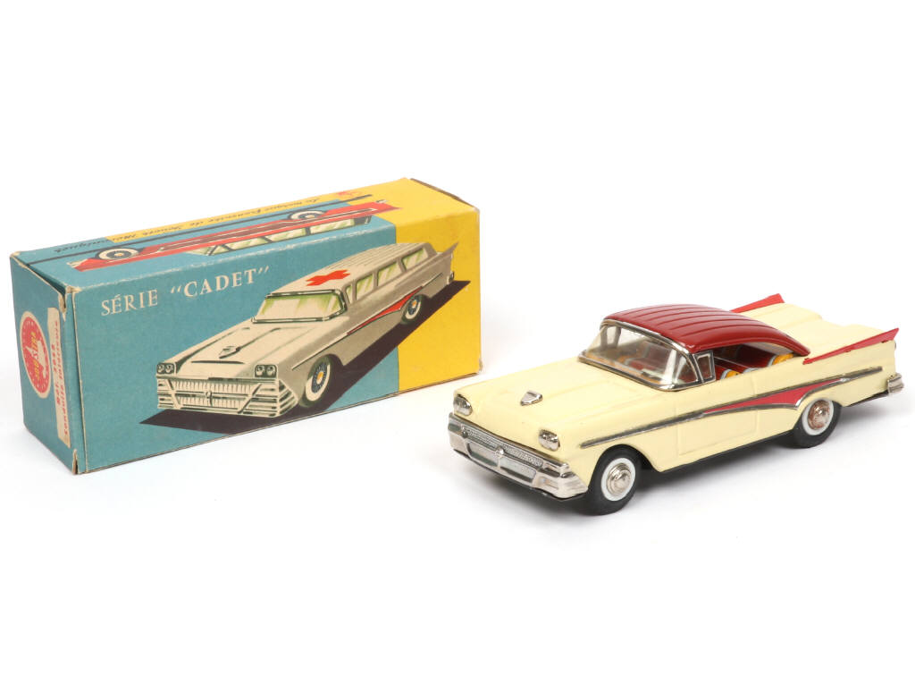 série 'CADET' - longueur : 20 cm - moteur à friction (fonctionne) - baguettes latérales de caisse ternies - petites traces d'oxydation sur un enjoliveur de roue - accrocs sur la boîte