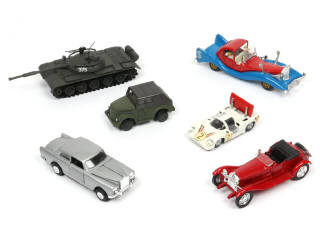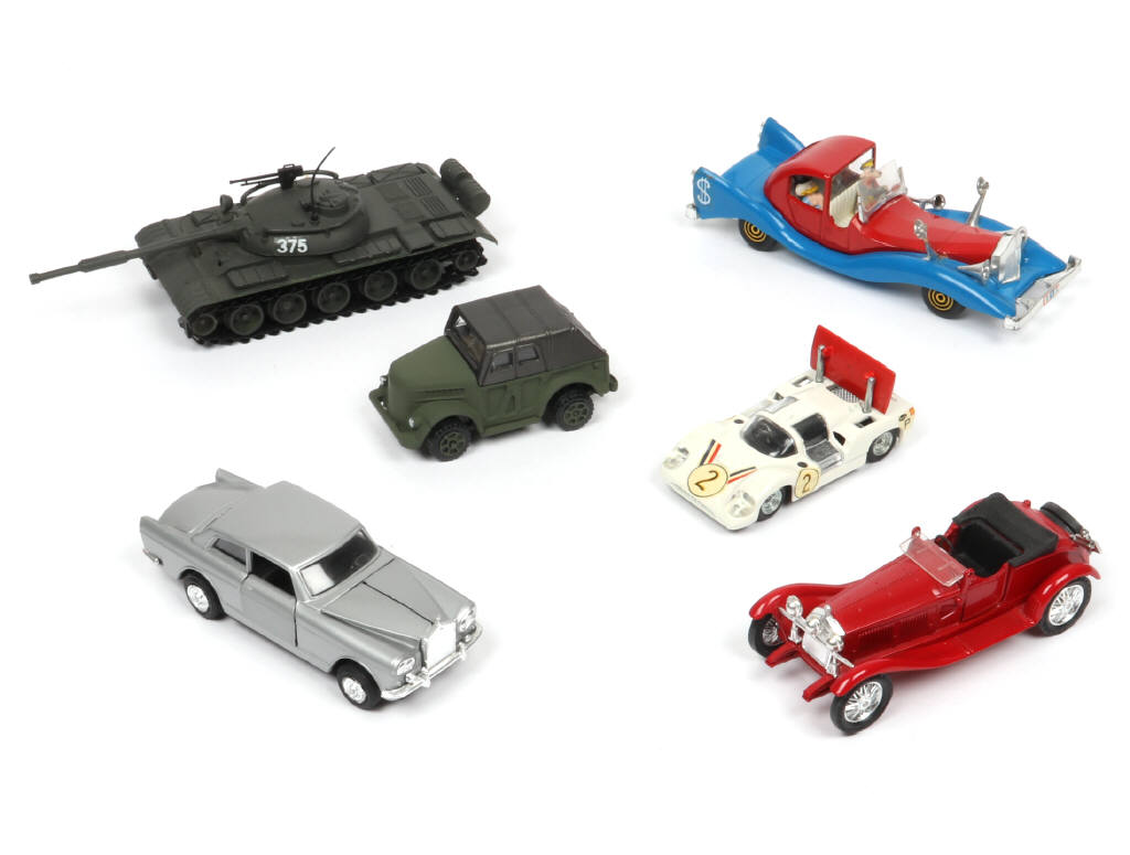 comprend notamment les modèles : ALFA ROMEO, GAZ, ROLLS ROYCE & CHAPARRAL (petites retouches sur le bas de caisse, décalques ajoutés) - on y retrouve les marques : POLISTIL & POLITOYS - un modèle avec quelques traces de colle
