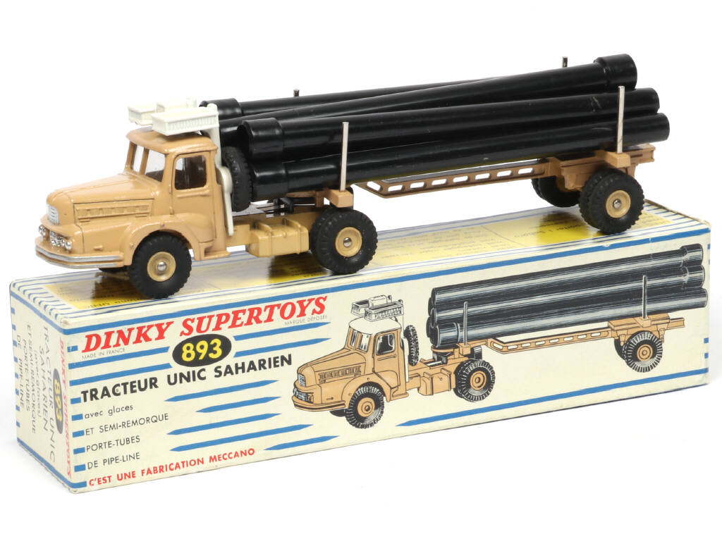 DINKY TOYS (FRANCE) 893 UNIC Saharien transport de pipe-lines (version avec jantes concaves & remorque ajourée) sable & blanc