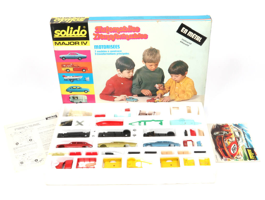 semble complet - dimensions : 55 x 38 cm - ensemble interchangeable à monter - contient : PEUGEOT 504, OPEL COMMODORE, RENAULT 16, FORD TAUNUS pick-up, caravane, canot, remorque, différents accessoires & notice - quelques accrocs sur la boîte par endroits (avec notice très légèrement tachée) - on y joint un catalogue de la marque (état 'b', petites annotations)