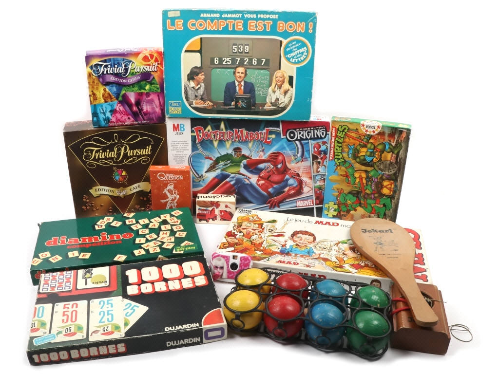 comprend : TRIVIAL PURSUIT (complet), LE COMPTE EST BON (manque une plaque numérotée), jeux de poche TENNIS QUESTION, TRIVIAL PURSUIT EDITION CAFE (complet, 3 sachets de questions jamais ouverts), DOCTEUR MABOULE SPIDERMAN (manque 3 éléments), PUZZLE TURTLE (complet), DIAMINO (manque notice), 1000 BORNES (complet), LE JEU DE MAD MAGAZINE (complet), une boite vide de LEGO référence : 601 (avec notice), UN JOKARI (élastique cassé), un jeu de boule en bois & un appareil photo BARBIE (non testé & incomplet) - boites en état 'b' à 'c' avec accrocs plus ou moins important