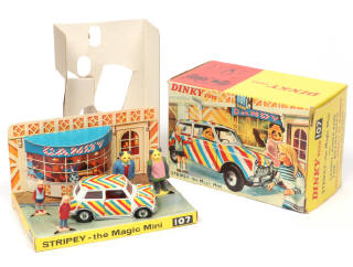 DINKY TOYS (GB) 107 MINI MINOR 'STRIPEY THE MAGIC MINI' blanc à chevrons bleus, jaunes & rouges