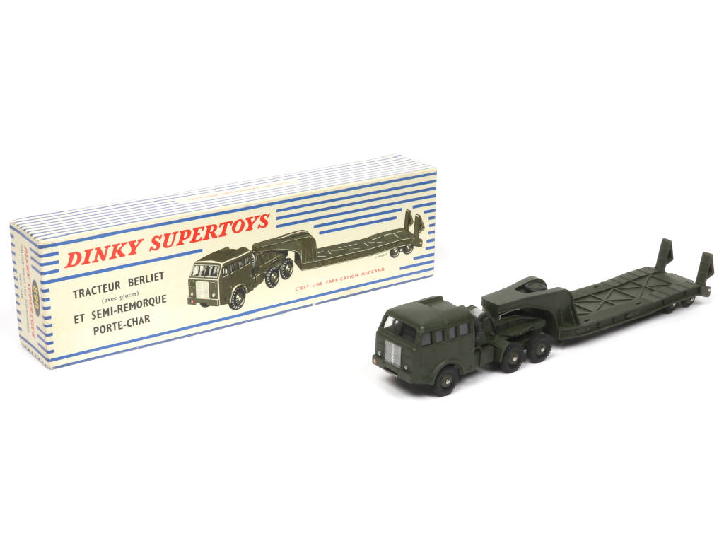 DINKY TOYS (FRANCE) 890 BERLIET Transport de char (version avec jantes du tracteur & de la remorque convexes) kaki