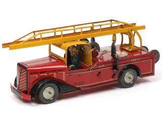 produit en 1951- longueur : 35 cm - avec moteur à clef, bruiteur, échelle mobile (ensemble fonctionnel), 4 pompiers & dérouleurs (ternis) - manque outils - un détail important de peinture noire ajouté sur l'avant & l'arrière du modèle - quelques petites traces d'oxydation par endroits