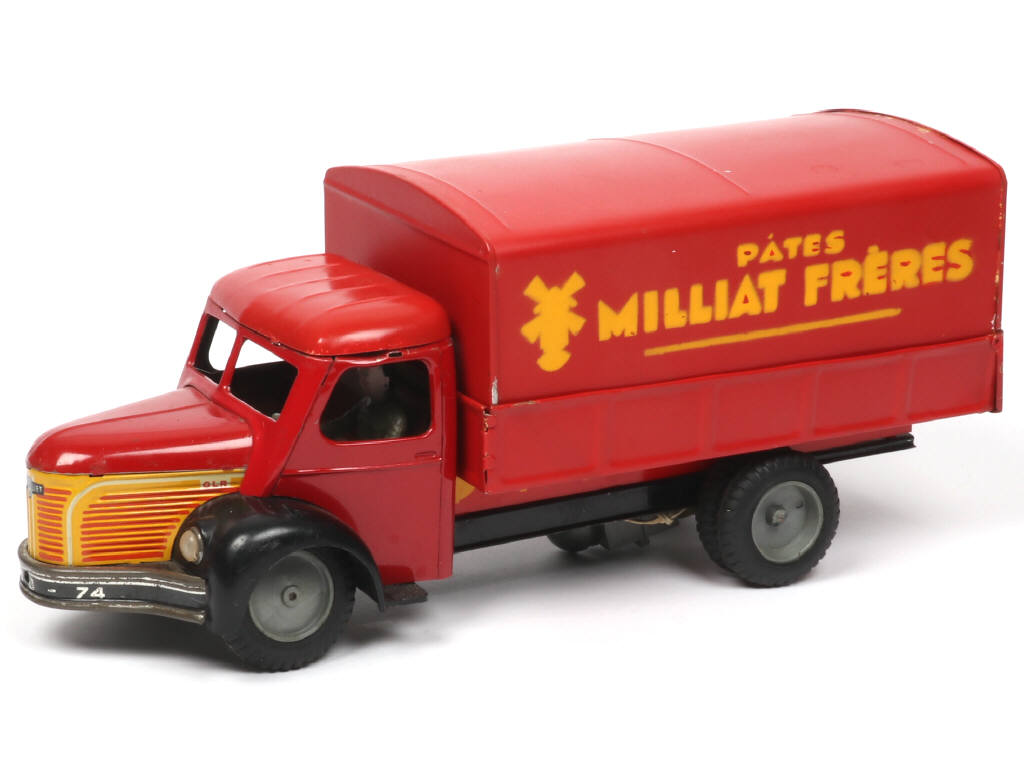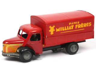 longueur : 38 cm - avec moteur à pile (à revoir), conducteur & direction - retouches plus ou moins importantes - restaurations avec parties non d'origine & repeintes (notamment la bâche, le plateau & le toit de cabine) - quelques manques - parties chromées ternies (traces d'oxydation à l'intérieur de la bâche)