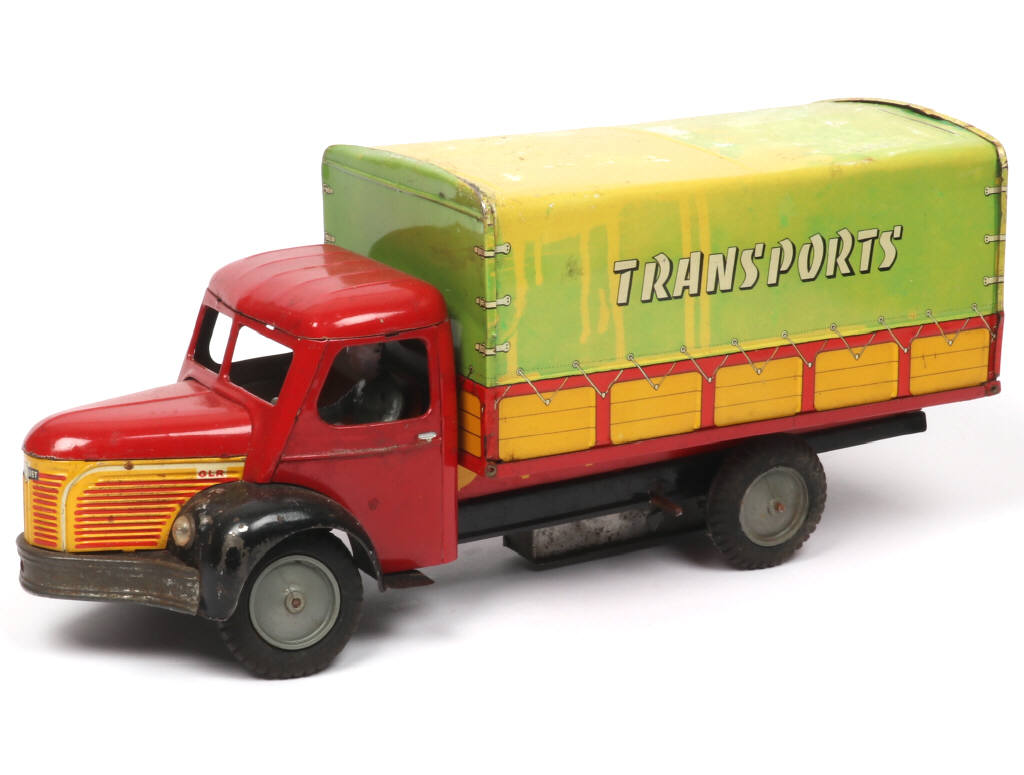longueur : 37 cm - avec moteur à clef (fonctionne), conducteur (un petit défaut de moulage) & direction (légèrement déformée avec fixations de roues fêlées & incomplètes) - pare-choc & entourages d'optiques de phares ternis - bâche décolorée, déformée & tachée - traces d'oxydation (principalement sur le plateau)