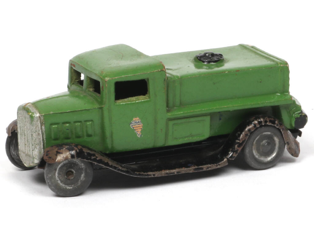 réalisation en plâtre & farine (carrosserie proche de l'état 'B') - longueur : 9,5 cm - un léger manque de matière sur l'arrière de la citerne - le châssis est en état 'D' (déformations) - décalques incomplets (dont un à 50%) - une extrémité d'axe de roues déformée