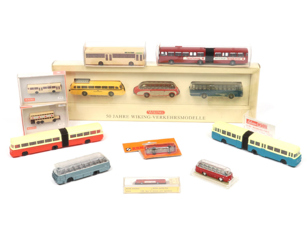 comprend notamment les modèles : SETRA, MAN, HENSCHEL, MERCEDES & BÜSSING - une boite en état 'd' (3 exemplaires sans) - on y retrouve les marques : WIKING, HAMMER, ARNOLD, NOCH & SCHUCO