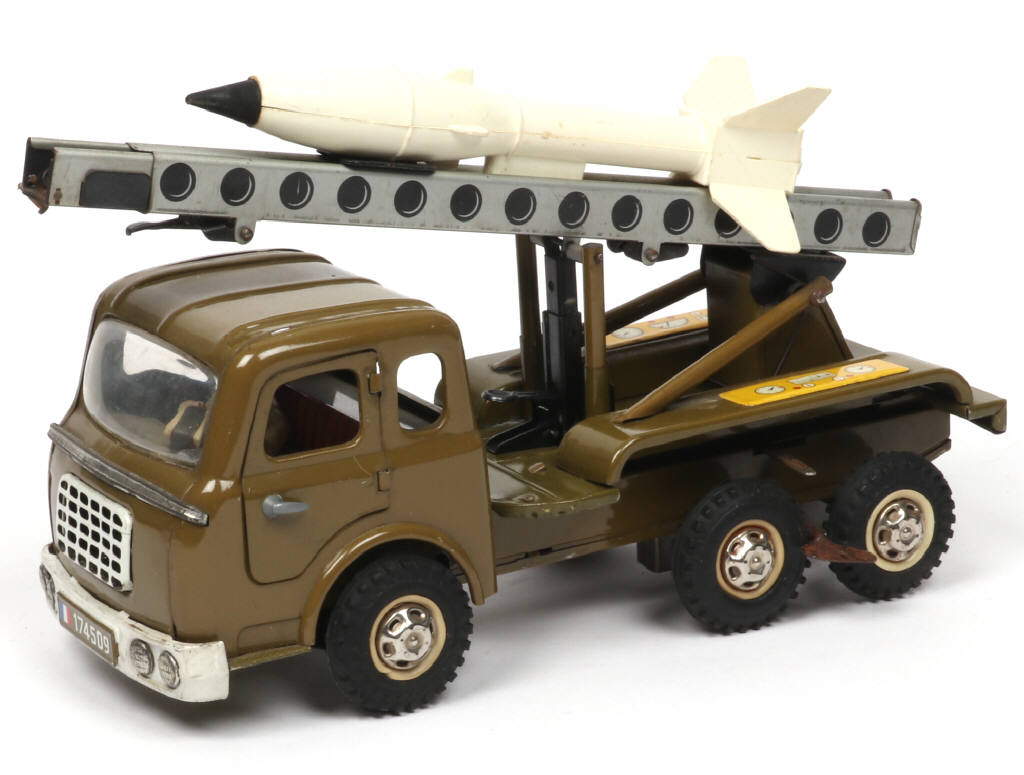 longueur : 28 cm - avec moteur à clef, système d'élévation de rampe de lancement (fonctionnent), système d'éjection de fusée (à revoir), clef (oxydée) & conducteur (désolidarisé) - bandeau de cabine & optiques de phares en partie ternis - quelques petites traces d'oxydation par endroits - ce lance-fusée militaire est équipé généralement de la cabine du SIMCA CARGO