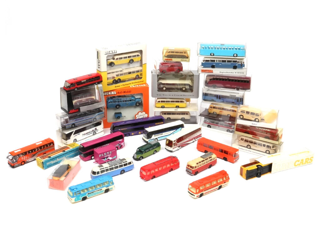 on y retrouve notamment les marques : BREKINA, PRALINÉ, LIMO CARS, EKO, REISE, SCHUCO & WIKING - possibilité de petits manques & parties cassées - boites en états 'b' à 'c' (quelques modèles sans)