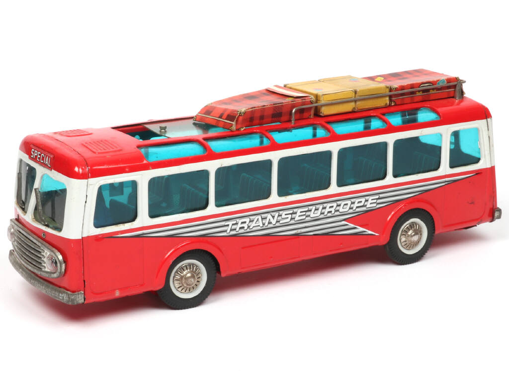 longueur : 39 cm - avec moteur à friction, essuie-glaces mobiles actionnés par les roues avant (ensemble fonctionnel) & 4 valises en carton sur la galerie (dont 2 déchirées & déformées) - parties chromées plus ou moins ternies (quelques traces d'oxydation sur les jantes) - vitrage très légèrement déformé & dégrafé par endroits