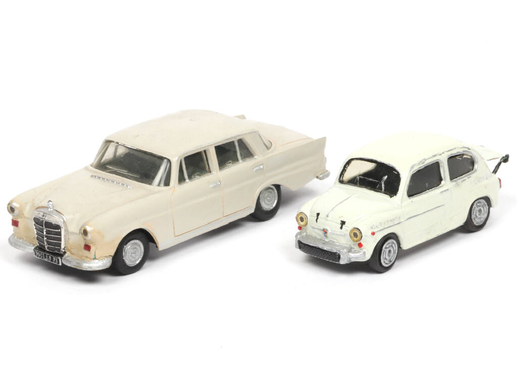 créations artisanales sur base NOREV - avec étiquettes 'CREATIONS RD-MANOU 1967 & 68 MARMANDE' (photocopies) collées sur les planchers - comprend : MERCEDES 220 & FIAT 600 ABARTH