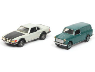 créations artisanales sur base NOREV - avec étiquettes 'CREATIONS RD-MANOU 1969 & 71 MARMANDE' (photocopies) collées sur les planchers - comprend : MERCEDES 350 SL & FIAT 1100 fourgonnette