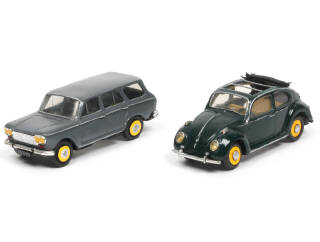créations artisanales sur base NOREV - avec étiquettes 'CREATIONS RD-MANOU 1968 MARMANDE' (photocopies) collées sur les planchers - comprend : FIAT 124 break (une petite fêlure d'origine sur le toit) & VOLKSWAGEN COCCINELLE découvrable