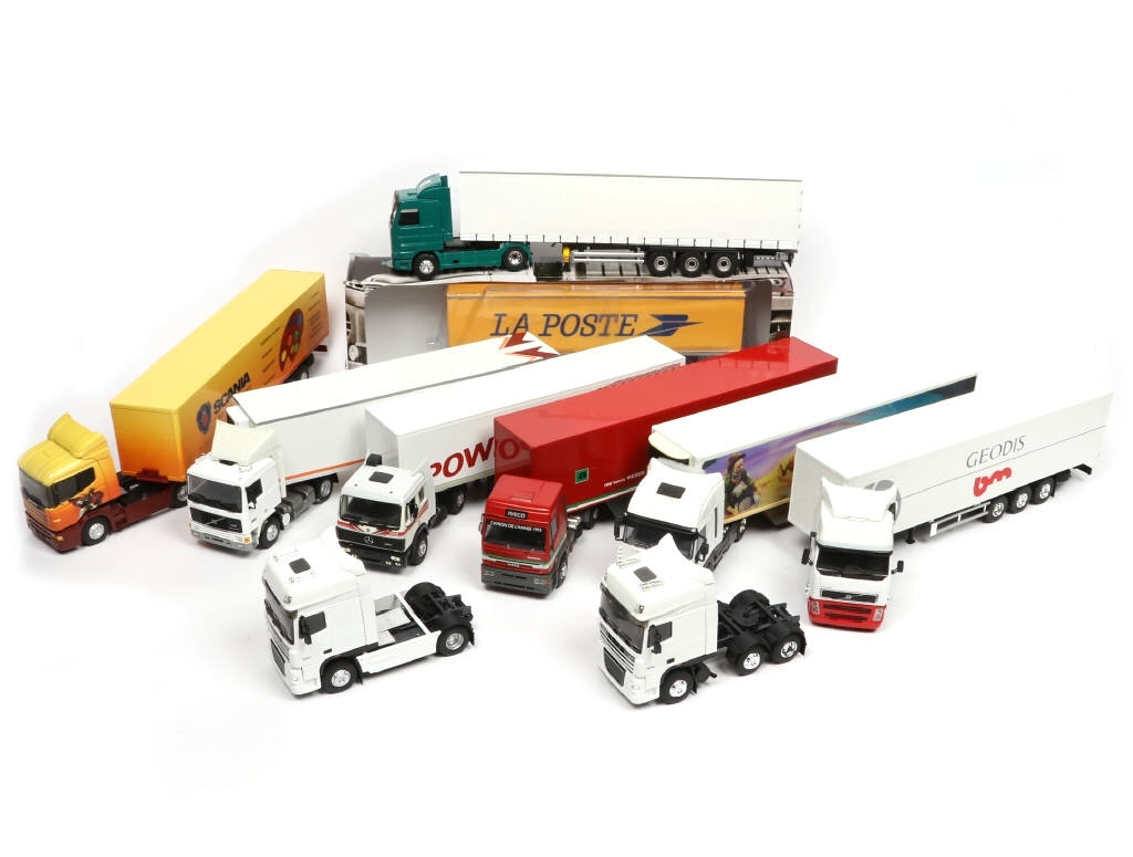 conprend notamment les modèles : IVECO, MERCEDES VOLVO, SCANIA & DAF - on y joint une remorque "LA POSTE" - possibilité de petits manques & parties cassées