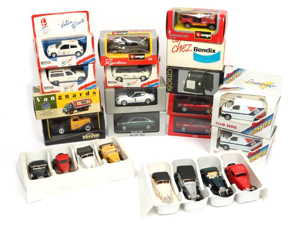 comprend notamment les marques VEREM, BENDIX & VANGUARDS - on y retrouve notamment les modèles : AUDI A6, RENAULT ESPACE, RENAULT CLIO & ALFA ROMEO 8C - 2 coffrets 4 voitures (carrosseries légèrement encrassées)
