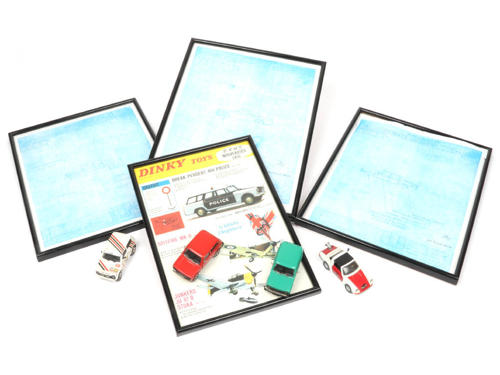 on y retrouve les marques : NOVOEXPORT & CORGI TOYS - quelques petits manques (transformations sur un exemplaire) - on y joint 4 photocopies de tirages ammoniac de modèles DINKY TOYS GB (manque un verre de cadre) & une affichette publicitaire DINKY TOYS FRANCE