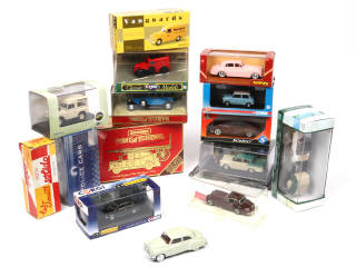 comprend notamment les modèles : JAGUAR (kit métal - boite SOLIDO non conforme), SIMCA, ROLLS ROYCE, AUSTIN & CHEVROLET - on y retrouve les marques : SPIELWAREN DANHAUSEN, VEREM, SOLIDO, OXFORD, CORGI & CARARAMA - 2 boites en état 'c'