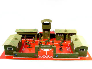 dimensions : 64, 5 x 41 x 18 cm - mirador avec bruiteur électrique fonctionnant par télécommande - on y joint 15 figurines à l'échelle - mât des couleurs & barrière d'entrée manquants - légère déformation du toit de la tour